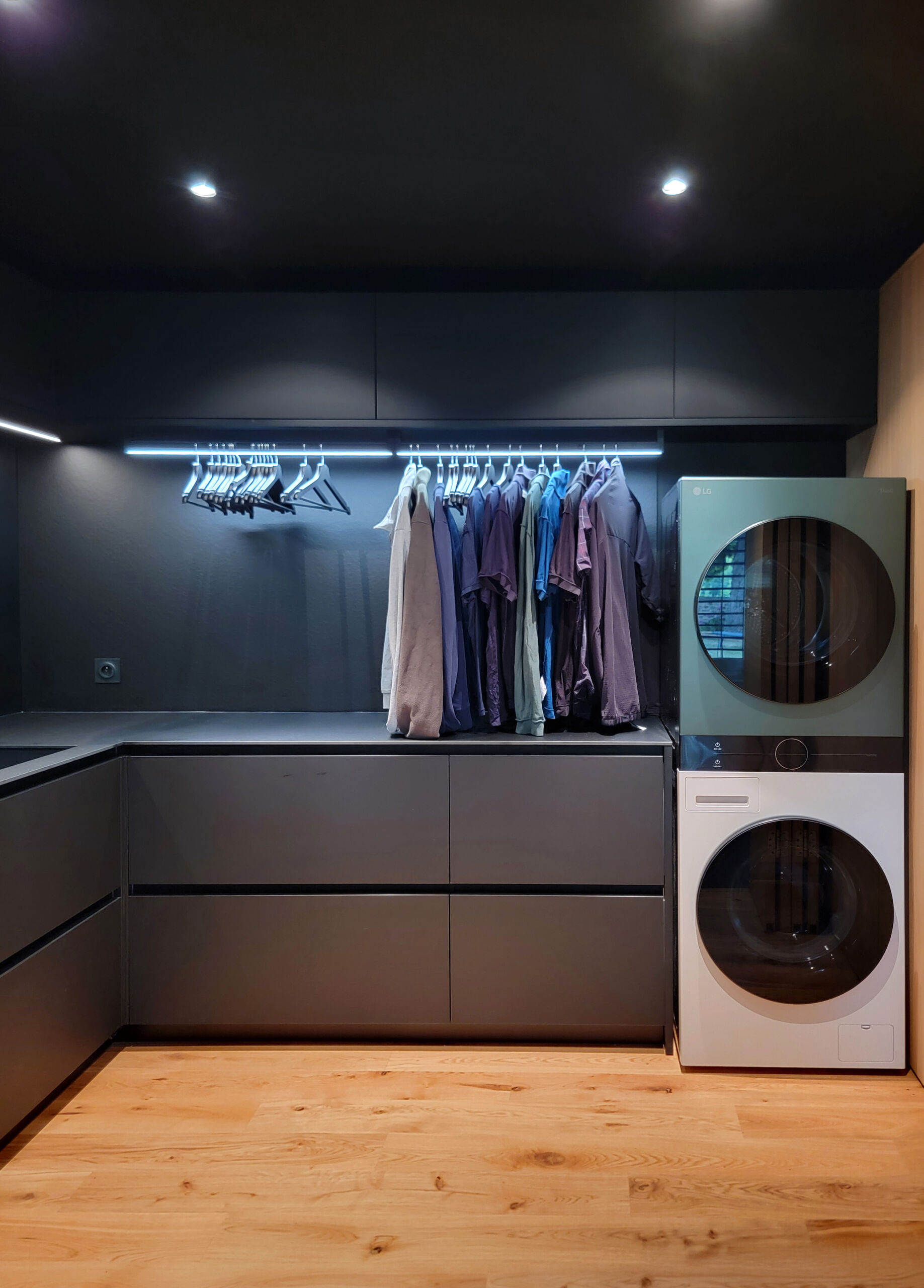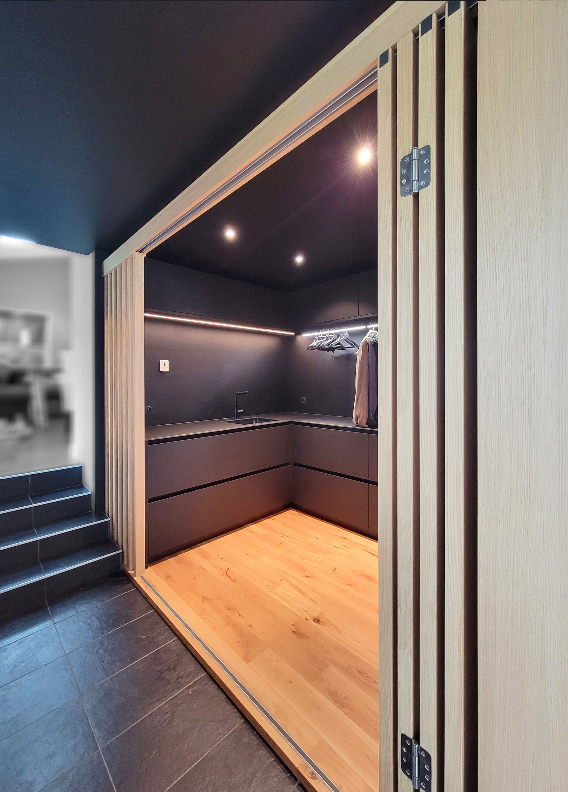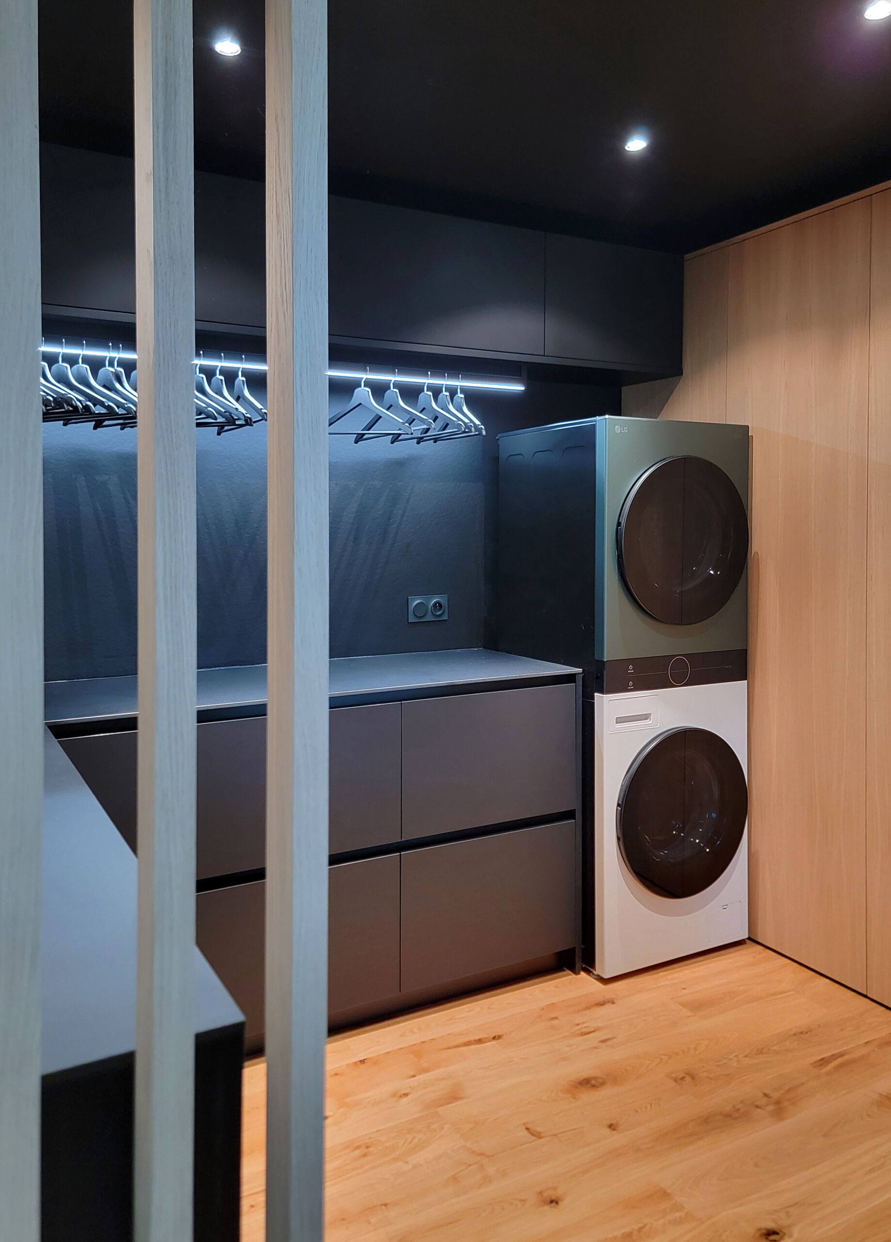 Réalisation d’une buanderie sur-mesure, astucieusement cachée derrière des portes pliantes !