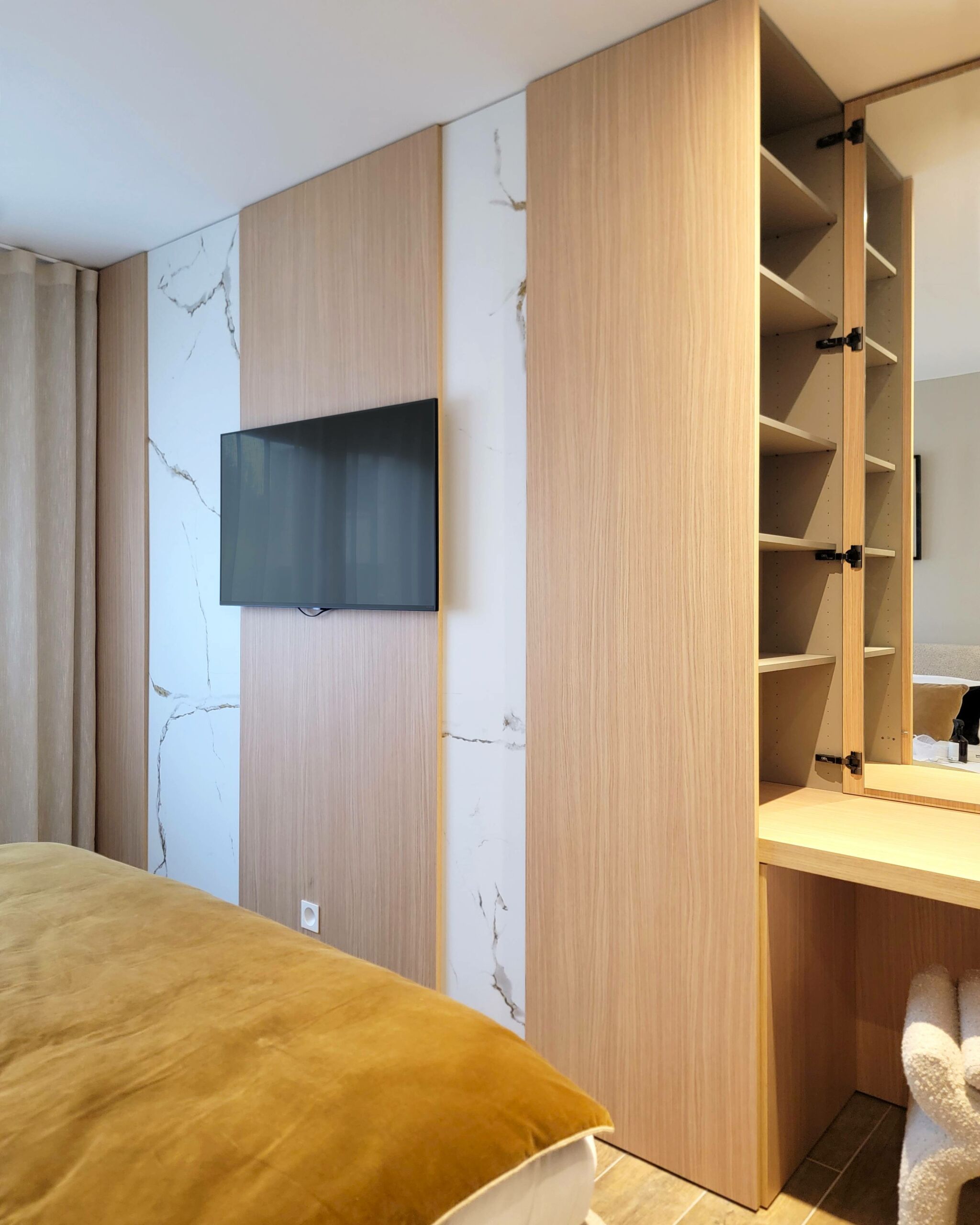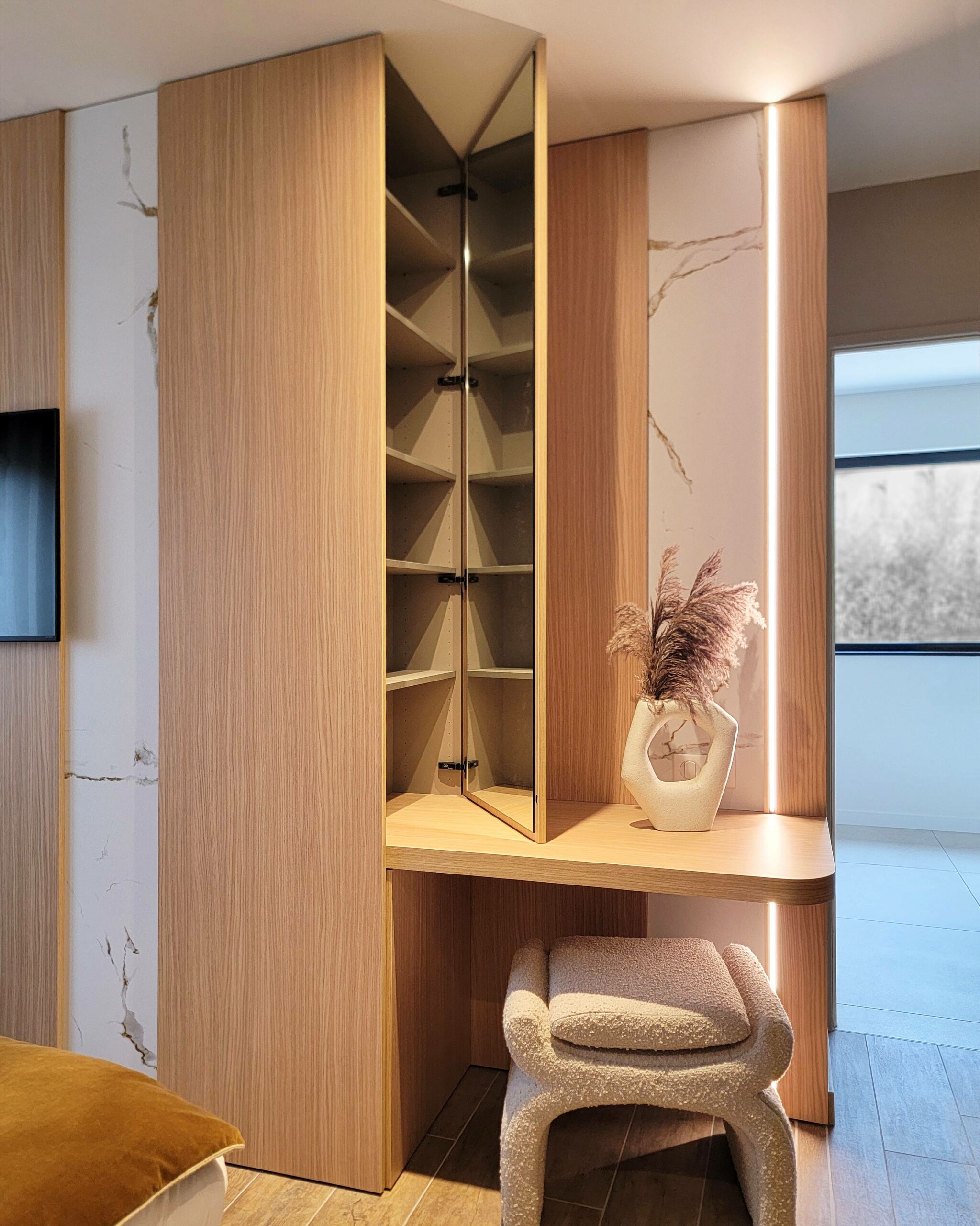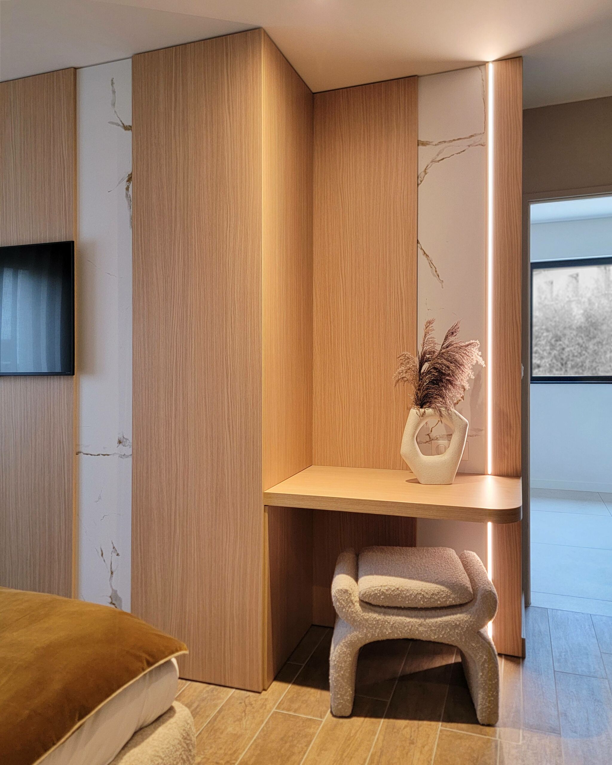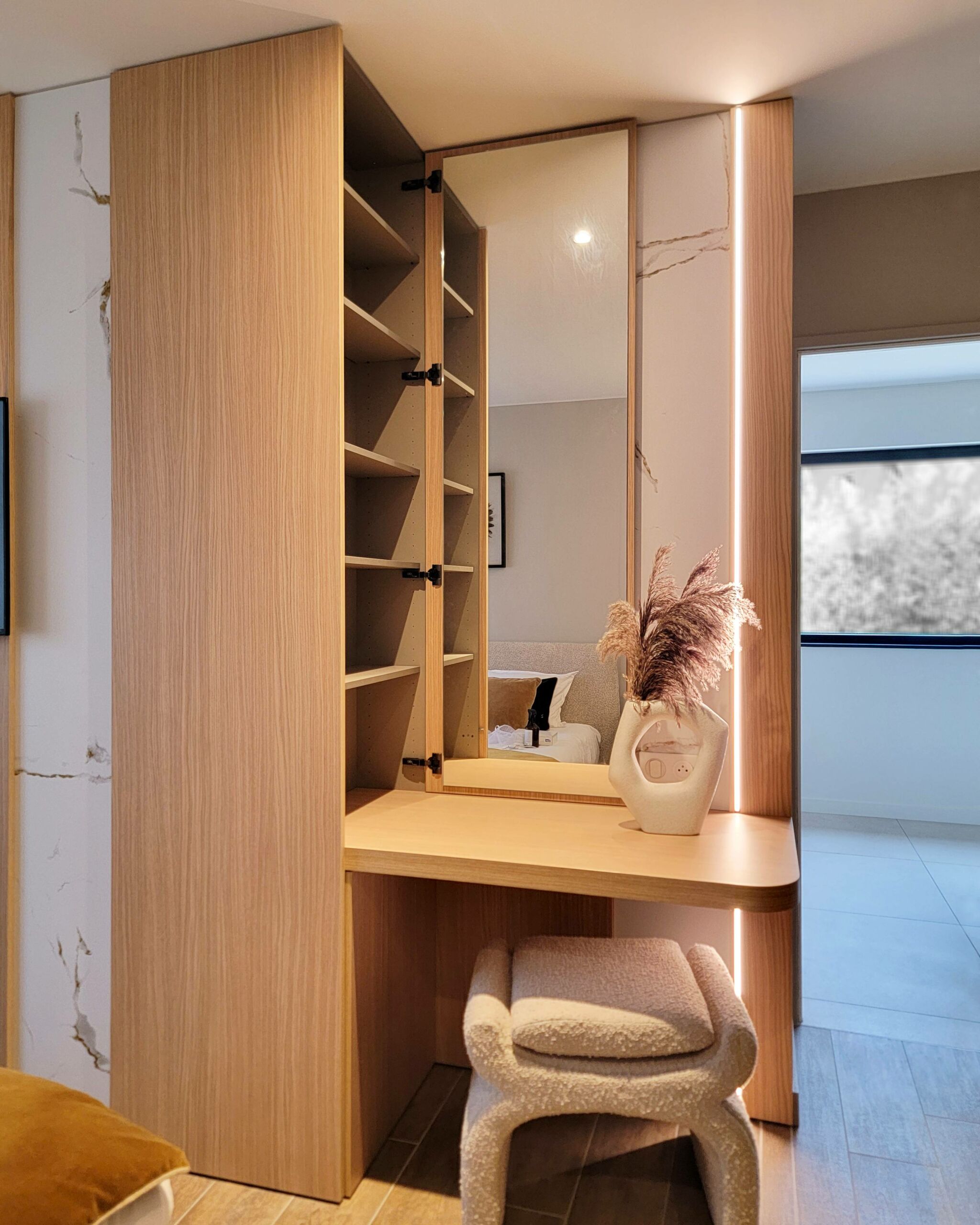 Conception d’un espace coiffeuse en chêne avec décor marbre KOBERT-IN, accompagné d’un dressing en laque mate de chez CACCARO