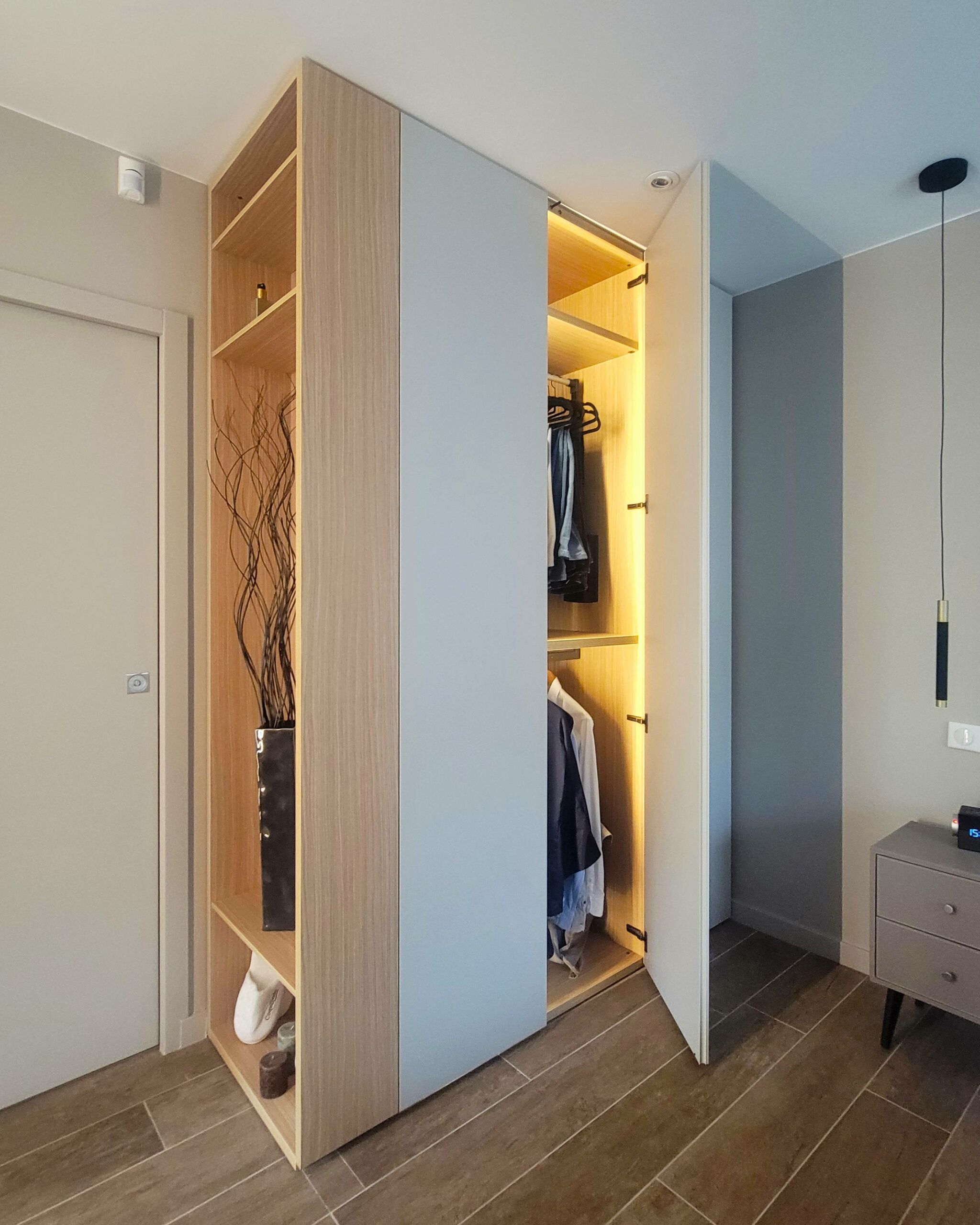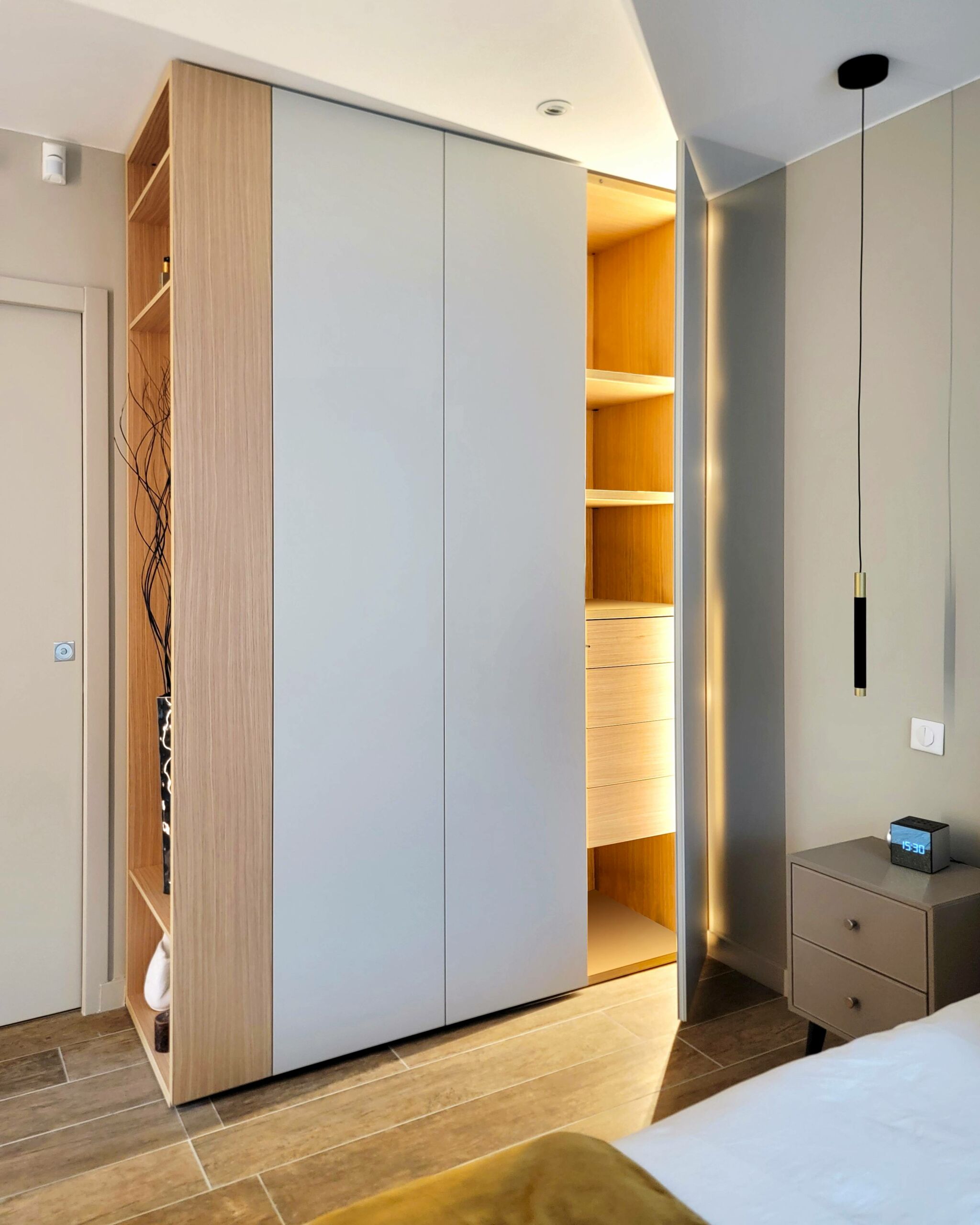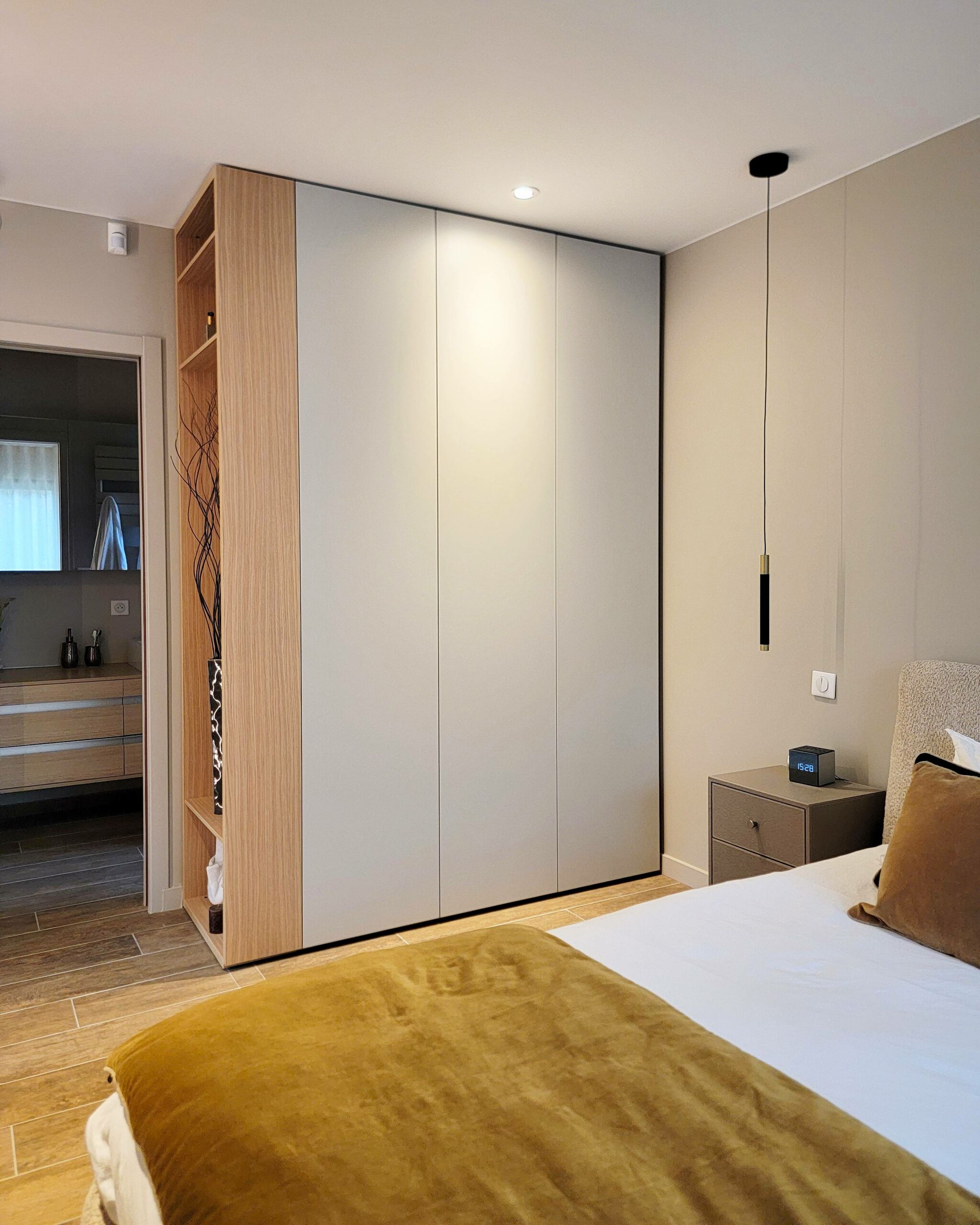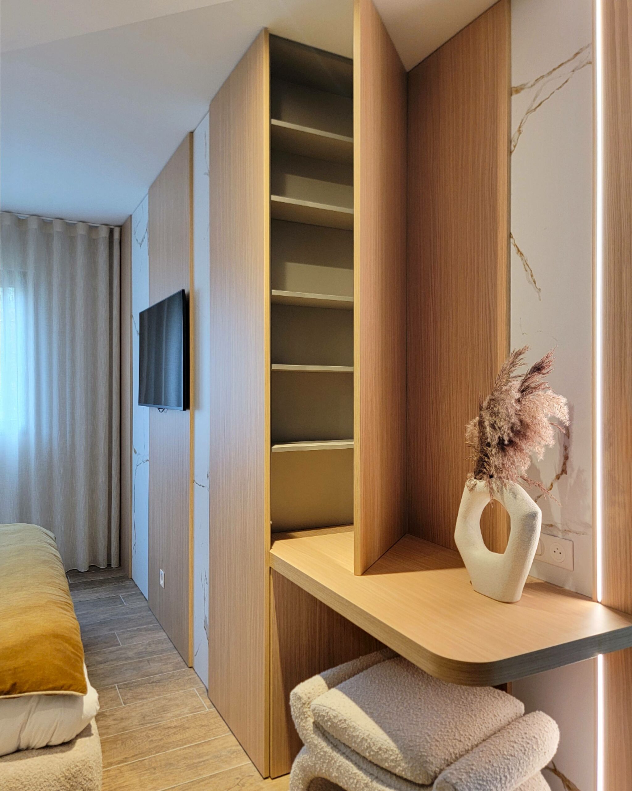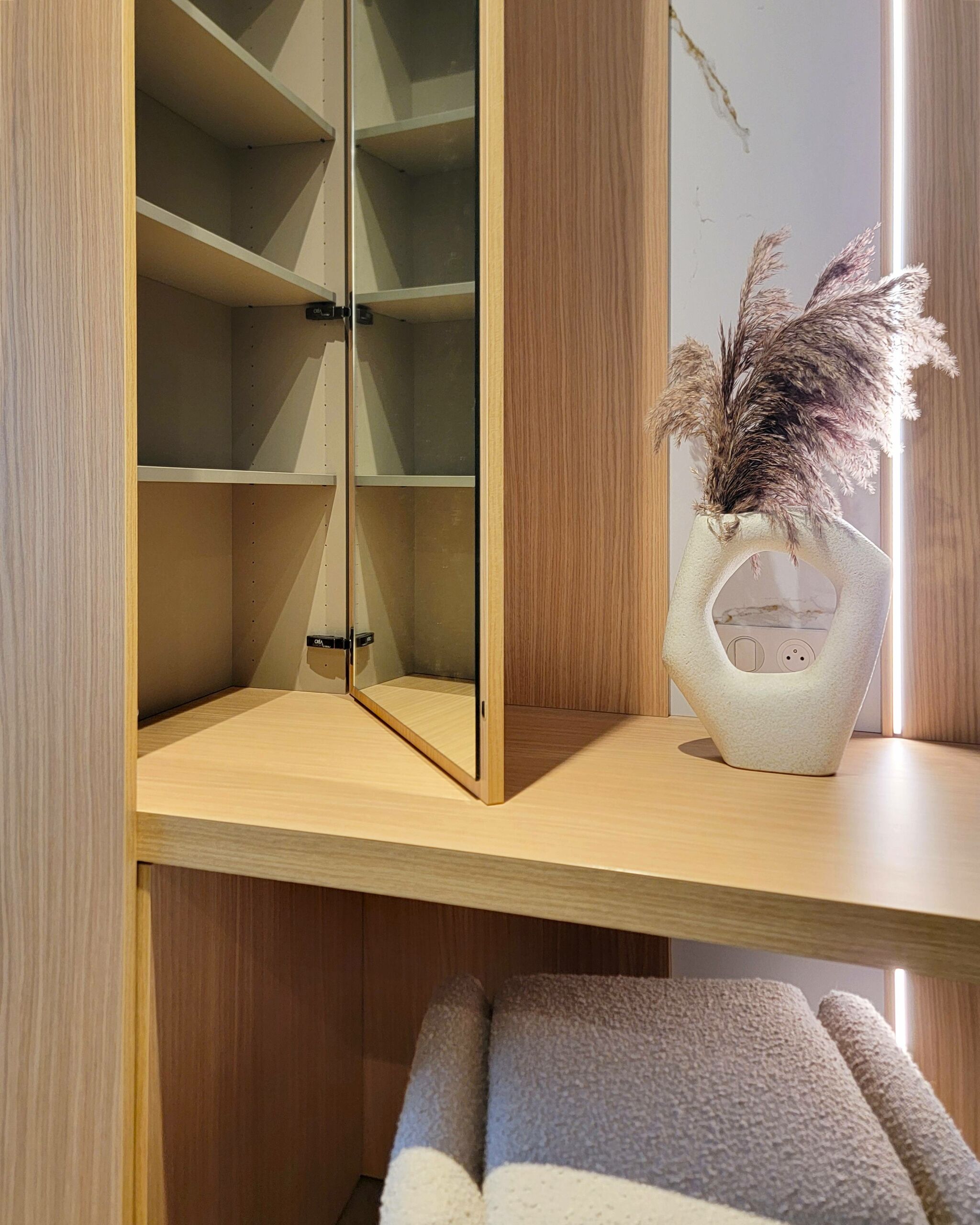 Conception d’un espace coiffeuse en chêne avec décor marbre KOBERT-IN, accompagné d’un dressing en laque mate de chez CACCARO